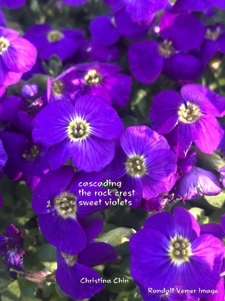 上部からニオイスミレが滝の如岩肌伝い岩に咲きつく