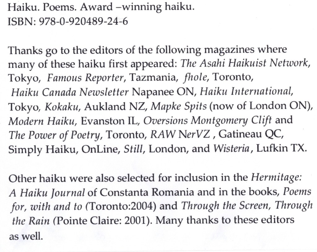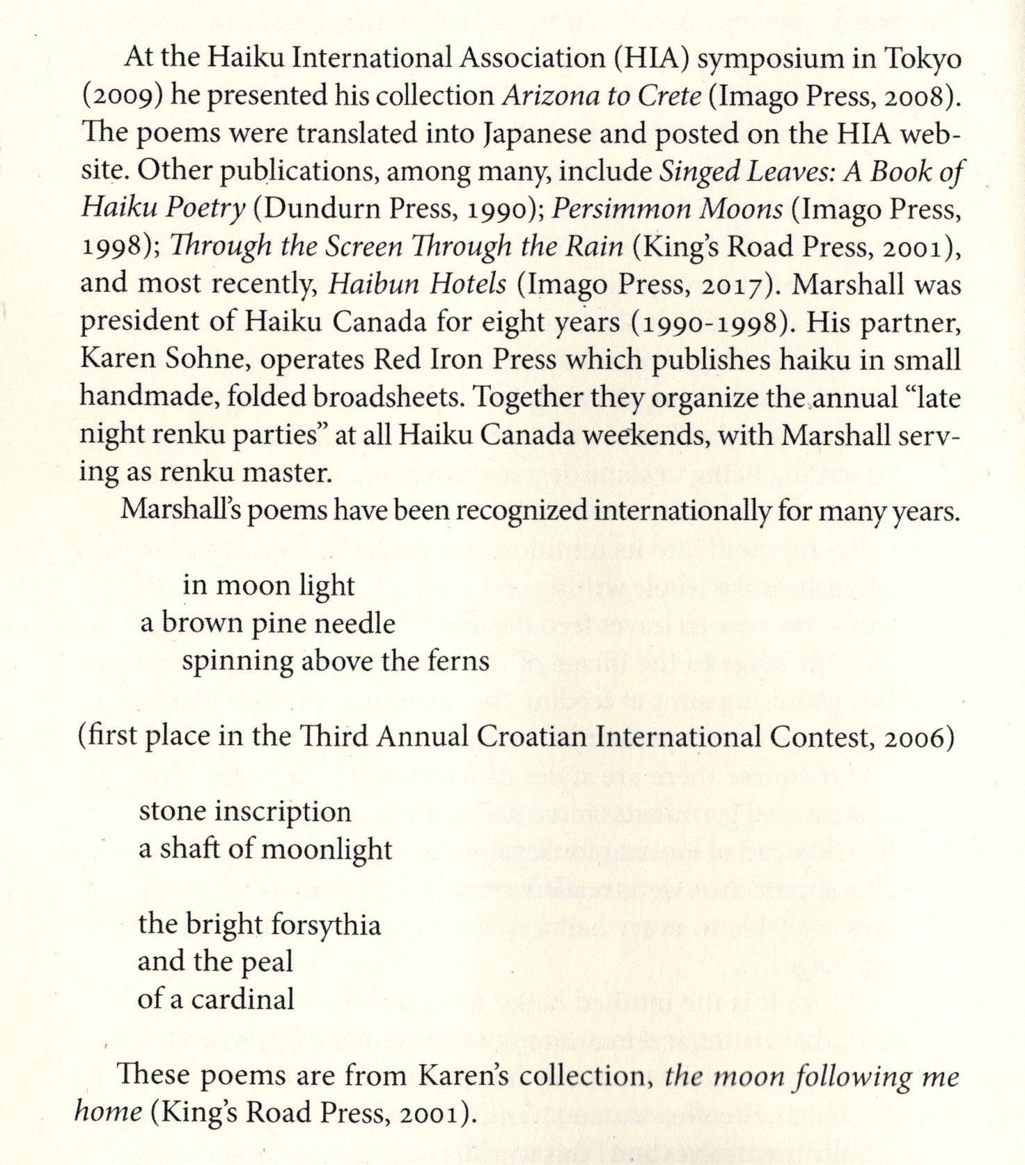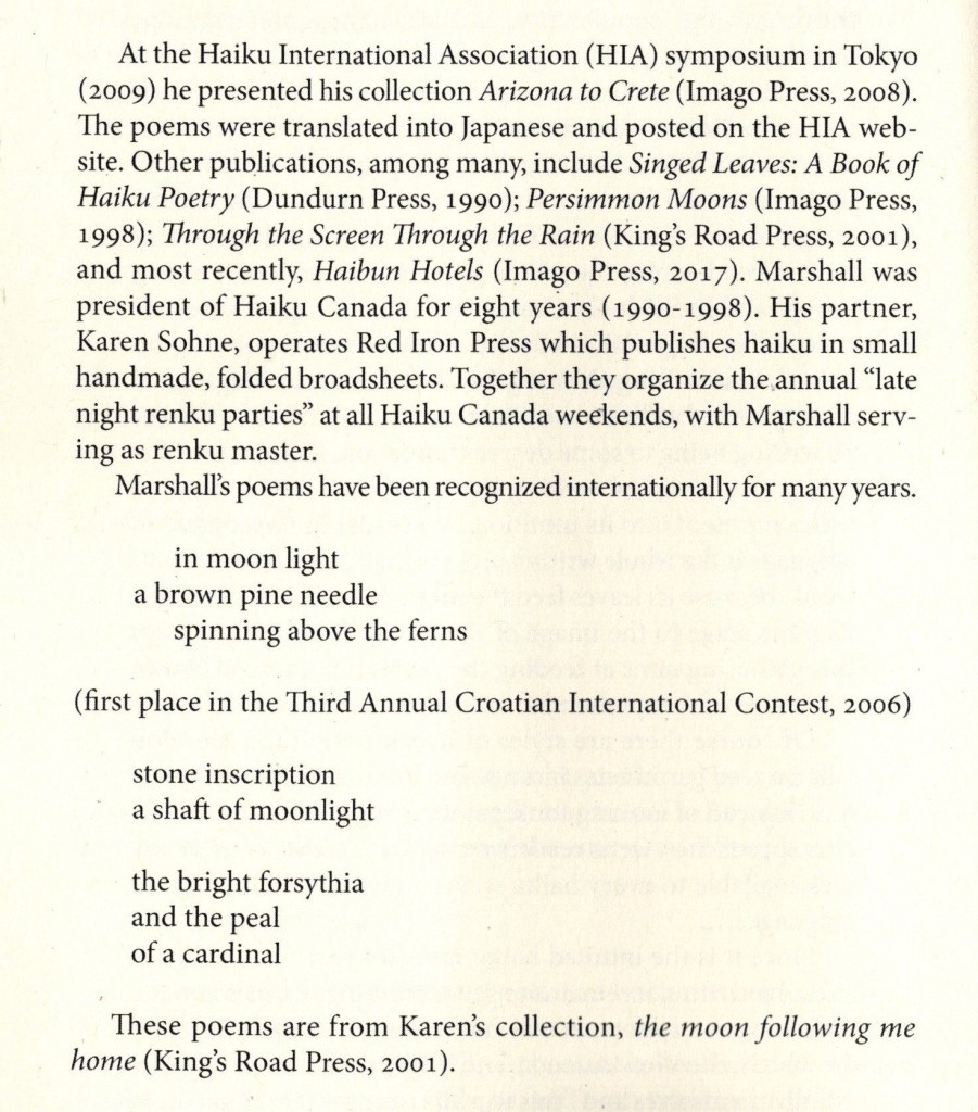 In her book Haiku in Canada: History, Poetry, Memoir, Terry Ann Carter introduces Marshall Hryciuk as follows.