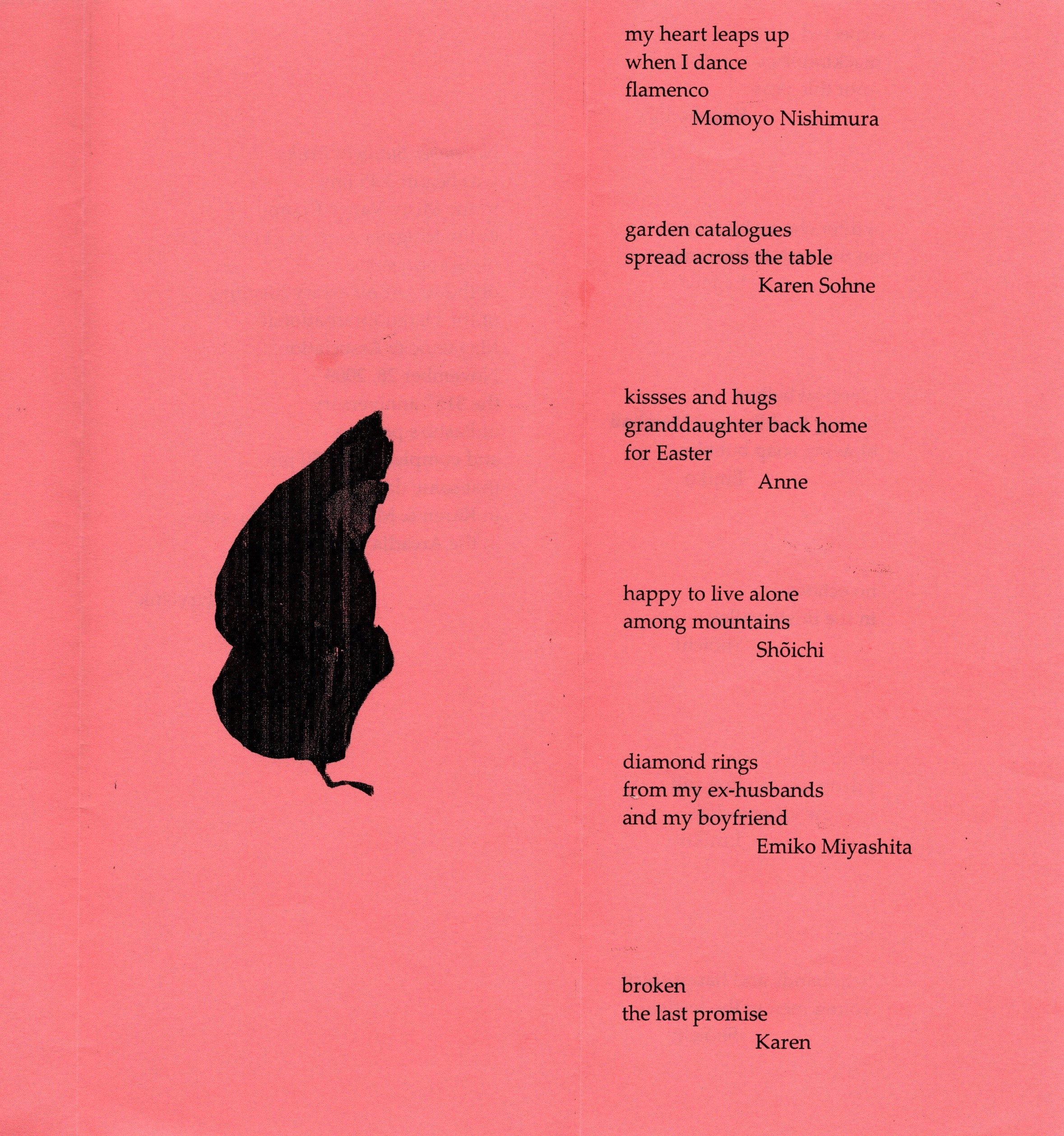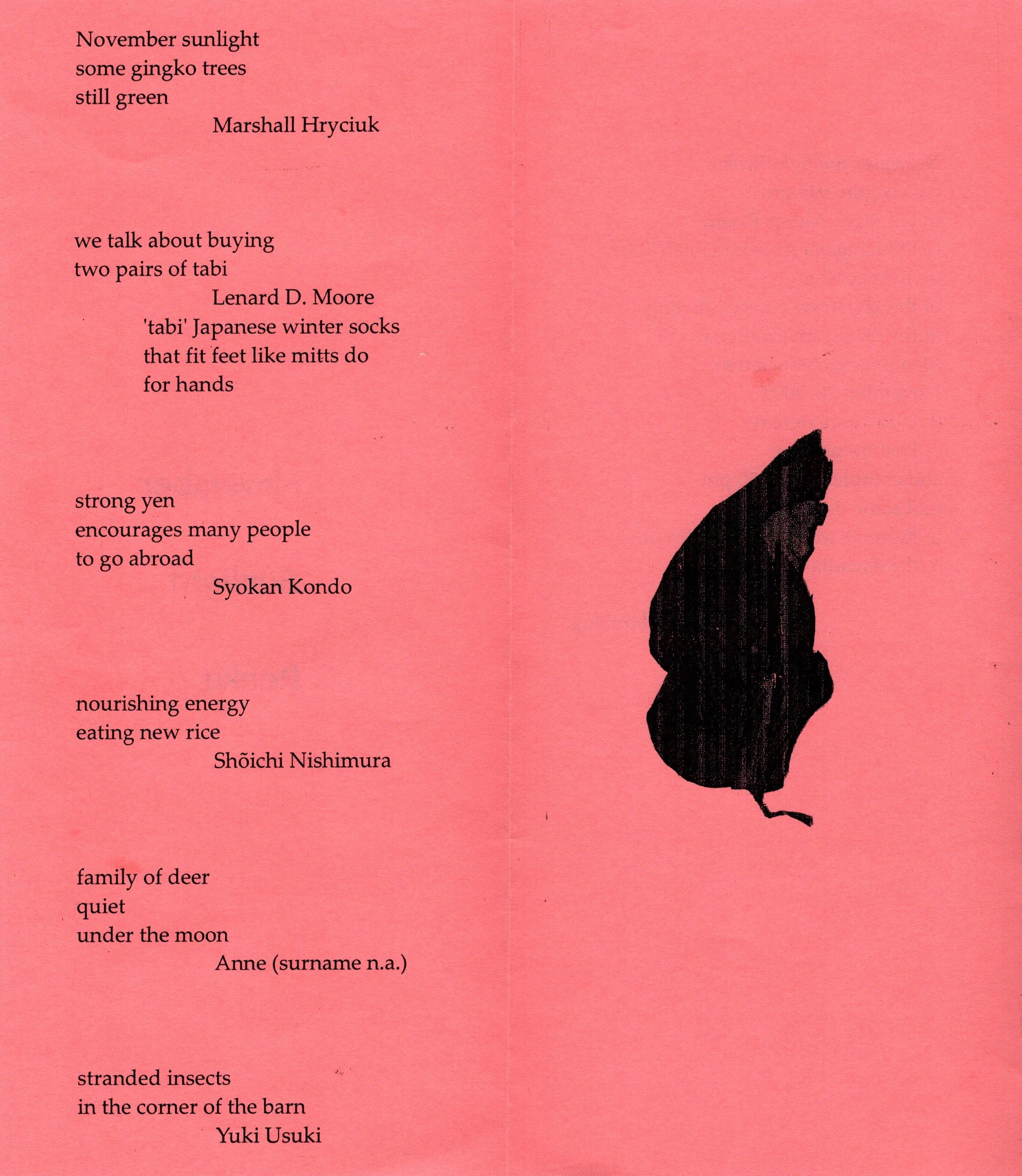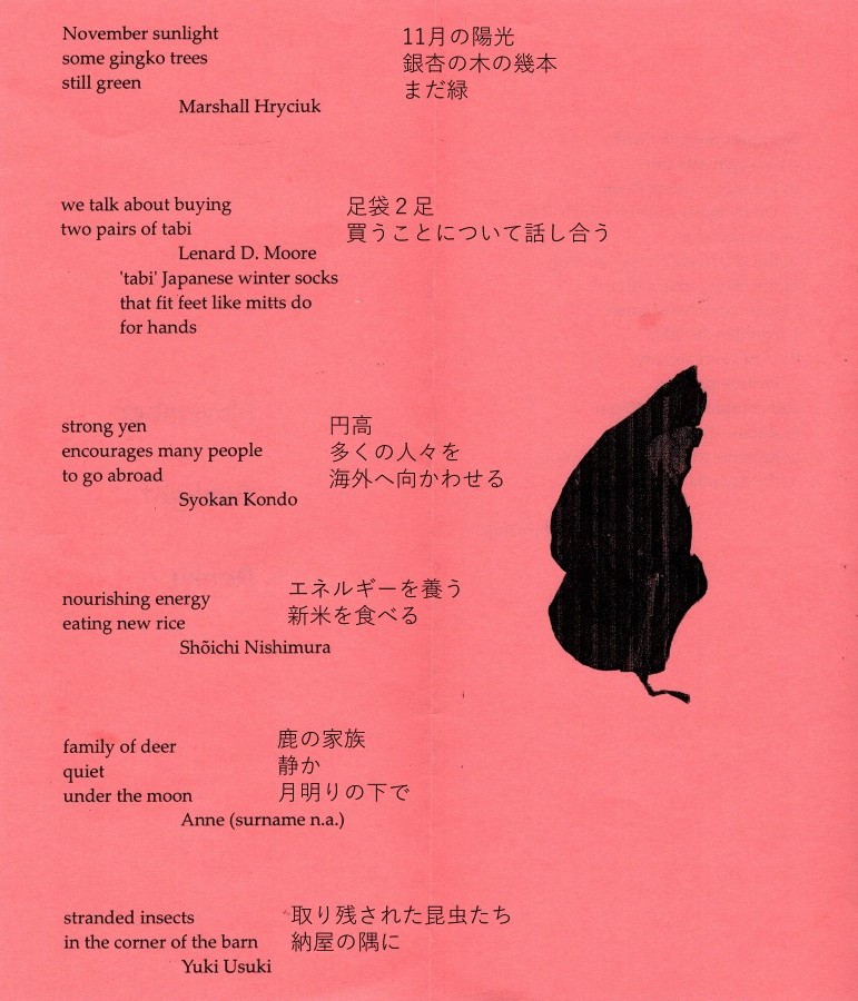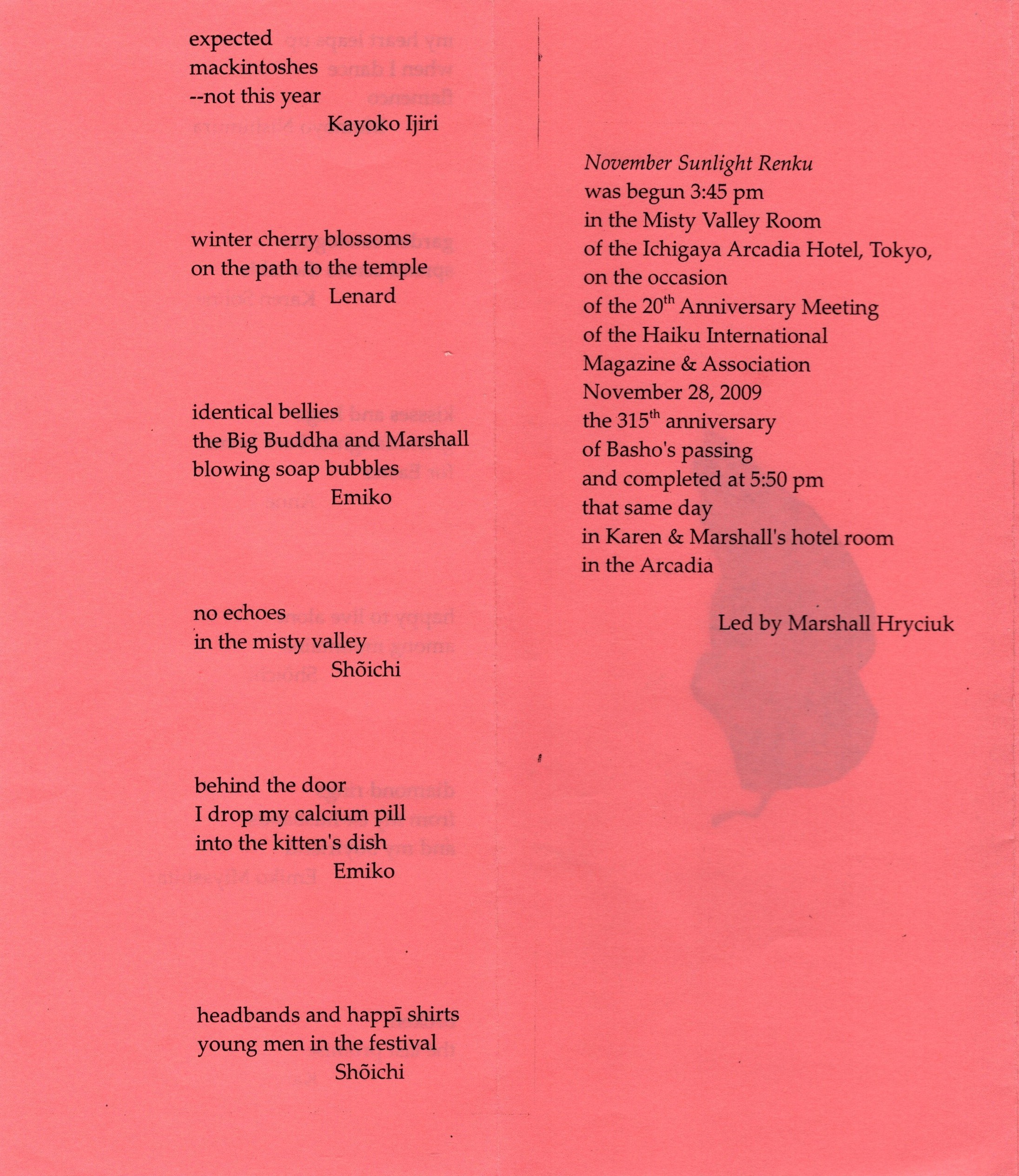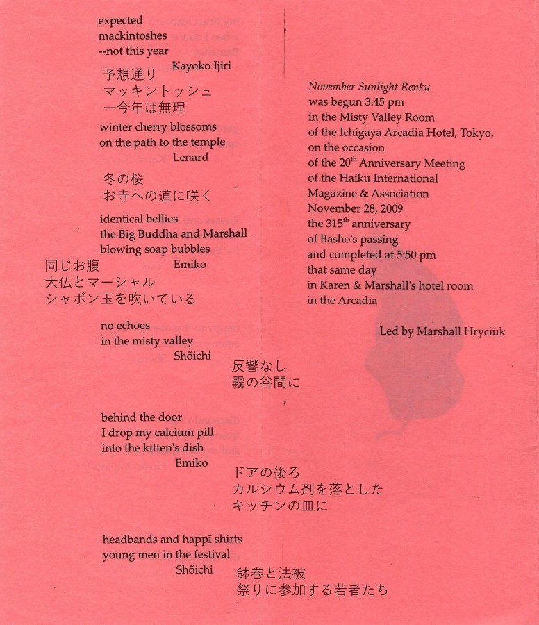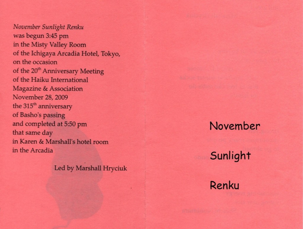 November Sunlight Renku was begun 3:45 pm in the Misty Valley Room of the Ichigaya Arcadia Hotel, Tokyo, on the occasion of the 20th Anniversary meeting of the Haiku International Magazine & Association November 28, 2009 the 315th anniversary of Bashō’s passing and completed at 5:50 that same day in Karen & Marshall’s hotel room in the Arcadia