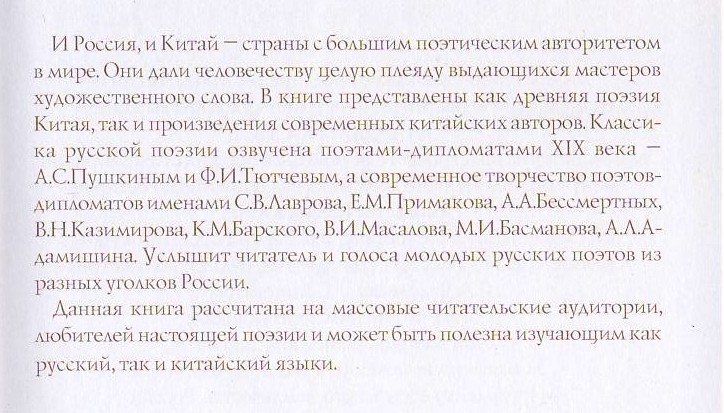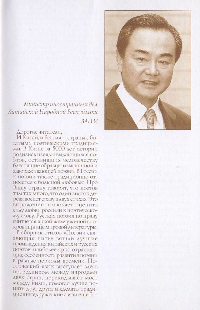 Mr. Wang Yi emphasized that “In China, over 5,000 years of history, a galaxy of outstanding poets were born, leaving humanity examples of exquisite and enchanting poetry. In Russia, poetry is also traditionally treated with great love. They say about your country that there are so many poets there that one leaf of a tree is sung by two poets at once.” The book has mirror translations from Russian into Chinese and from Chinese into Russian.