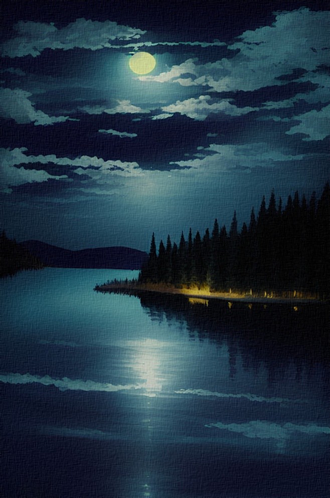 A lakeside at night: