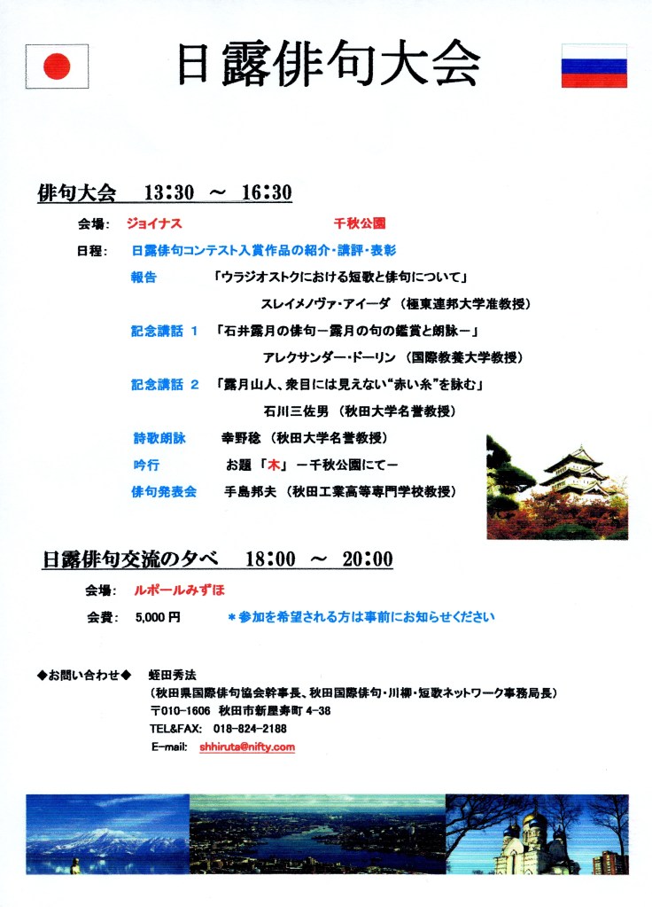 On September 22, a lot of Akita people gathered to attend the prize-presenting ceremony of Japan-Russia Haiku Contest, to listen to the report and talks on haiku, and poetry recitation. They also enjoyed haiku walk.
