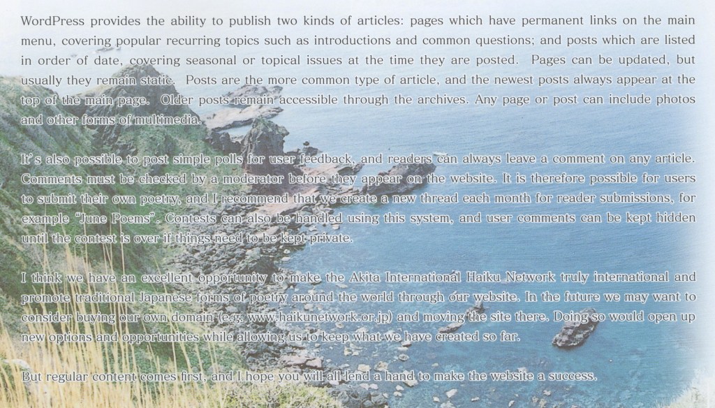 I understand that your network’s motto and the aims of our association are exactly the same. Our association has been active for the past 20 years with the aims of “helping people around the world correctly understand Japanese thoughts and actions through haiku, deepening mutual understanding through haiku, and translating the haiku we write into English and sharing them with people around the world.”