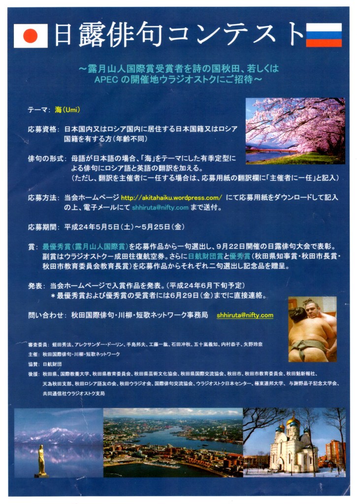 To the delight of our network, in 2010 Akita Prefecture concluded a comprehensive friendship agreement with the administrative government of Primorsky Krai, Russia, which is located where the former Bohai Kingdom was. Returning to the origins of Akita international posture, which seeks to open a window to the world, we have renewed our determination to spread the culture of Japanese poetry throughout the world.