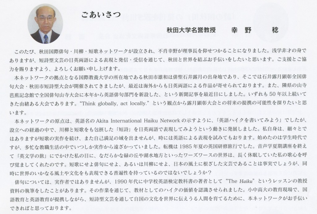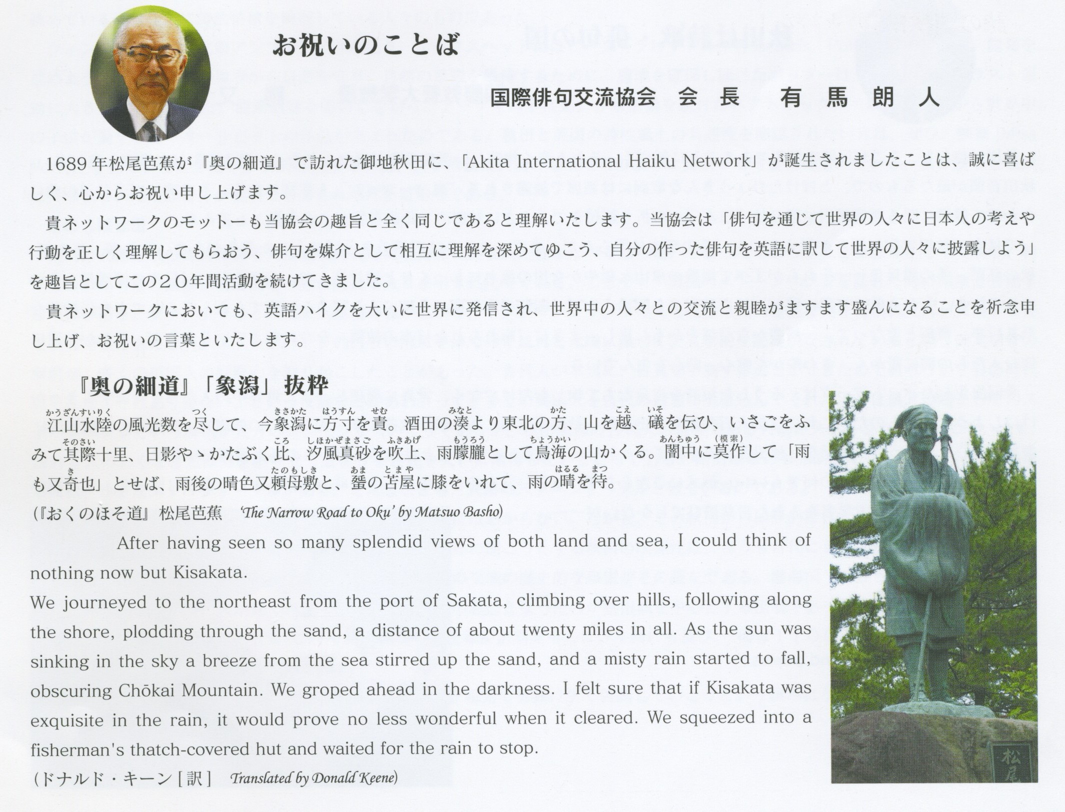 We are delighted and would like to offer our heartfelt congratulations on the establishment of the Akita International Haiku Network in Akita, the land visited by Matsuo Basho in 1689 during his travelogue, “The Narrow Road to the Deep North.”